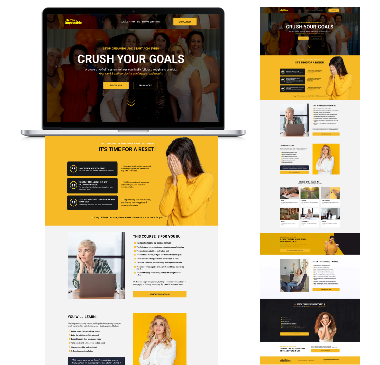 Designed and developed a high-converting sales funnel for the Crush Your Goals course. The funnel clearly guides users through the course benefits, modules, and outcomes while building trust and urgency. Built with a clean, motivational layout, it features bold calls to action and strong messaging to drive course enrollments and increase engagement.