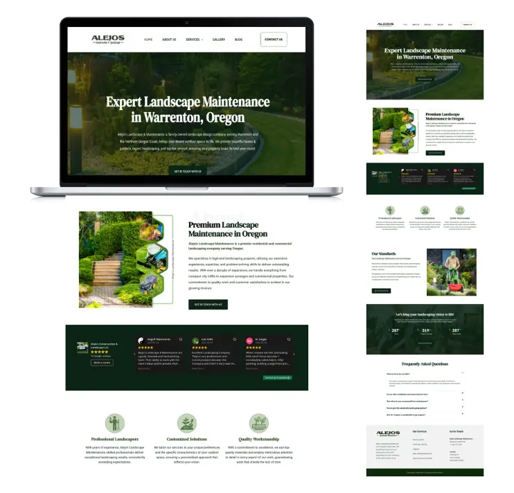 Developed a comprehensive website for Alejo’s Landscape & Maintenance, a family-owned landscaping company serving Warrenton and the Northern Oregon Coast. The site features a clean, professional design that effectively showcases their services including landscape maintenance, hardscaping, and commercial/residential projects. Key features include integrated customer testimonials, service breakdowns, FAQ section, and contact forms designed to convert visitors into leads.